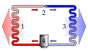 A simple stylized diagram of the refrigeration cycle: 1) condensing coil, 2) expansion valve, 3) evaporator coil, 4) compressor.